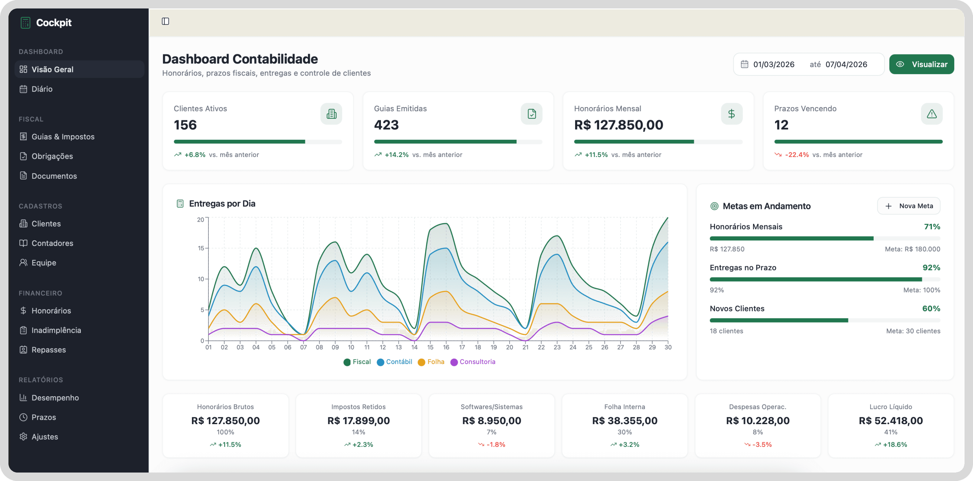 O Cockpit centraliza honorários, prazos fiscais e documentos de todos os seus clientes — e avisa antes de qualquer prazo vencer.