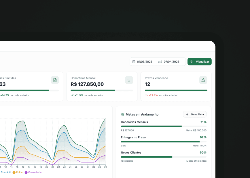 O Cockpit para contabilidades centraliza honorários, prazos fiscais, documentos e comunicação com clientes em um único painel — com IA que avisa antes do prazo vencer.